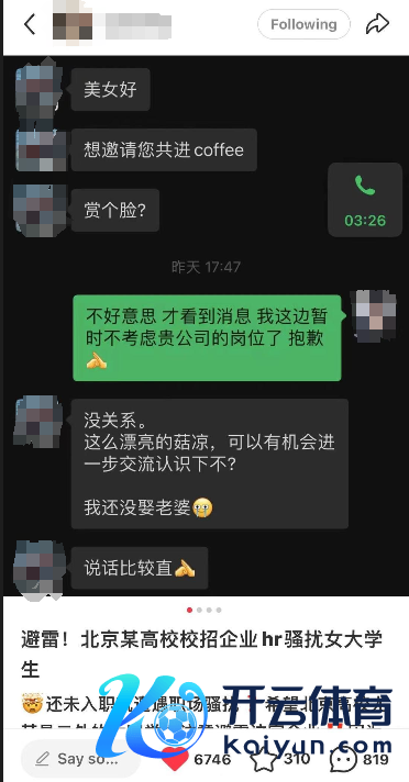 小田在网上发布的聊天截图和关连笔墨知道,由于她心仪的一家企业在北京某高校进行校招,于是到该双选会送达简历。结束后往外行运被须眉马某叫住,马某向小地主动先容其公司,反复强调“无门槛、不卡专科、既是招东谈主力亦然给他招助理”。马某还向她提取简历,在她屡次拒却的情况下,马某仍邀请她上车详谈。小田以为不对劲,但琢磨到对方系校招企业HR,她仍国法的添加了对方微信。过后马某发音问夸小田漂亮、有魔力,还邀请她喝咖啡,还称我方没内助,问她是否琢磨进一步发展。