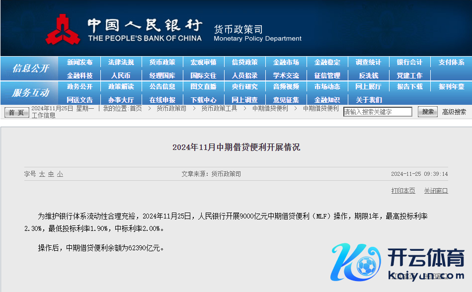 11月25日,据中国东谈主民银行(以下简称“央行”)网站音问,央行开展9000亿元中期假贷便利(MLF)操作,期限1年,最高投标利率2.30%,最低投标利率1.90%,中标利率2.00%。操作后,中期假贷便利余额为62390亿元。