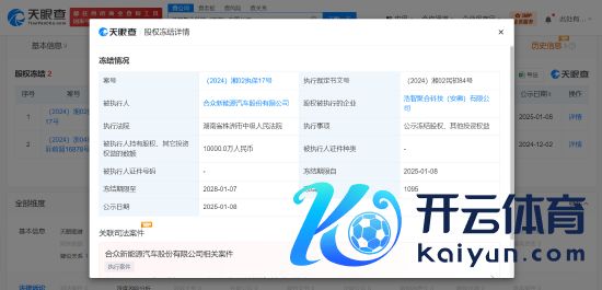 新浪科技讯 1月10日下昼音讯,天眼查深度风险信息显现,近日,哪吒汽车关连公司合众新动力汽车股份有限公司新增一条股权冻结信息,股权被实验的企业为浩智团聚科技(安徽)有限公司,被冻结股权数额1亿东谈主民币,冻结期限自2025年1月8日至2028年1月7日,实验法院为湖南省株洲市中级东谈主民法院。