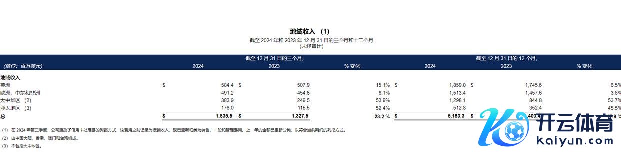 从区域市集来看,大中华区成为亚玛芬体育2024年增长最为权臣的区域。2024年,大中华区的收入12.98亿好意思元,同比增长53.7%;亚太地区5.13亿好意思元,同比增长45.5%;好意思洲地区18.59亿好意思元;欧洲、中东和非洲地区(EMEA)15.13亿好意思元。