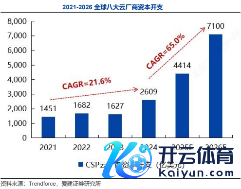 TrendForce数据潜入,Google、AWS、Meta、Microsoft、Oracle、腾讯、阿里巴巴、百度这八大云工作厂商的成本开支从2021年的1451.0亿好意思元增长至2024年的2609.0亿好意思元,2021-2024年复合增长率达21.6%;该机构进一步预测,2026年大家八大云工作厂商成本开支有望达到7100亿好意思元,2024-2026年复合增长率或将达到65.0%。