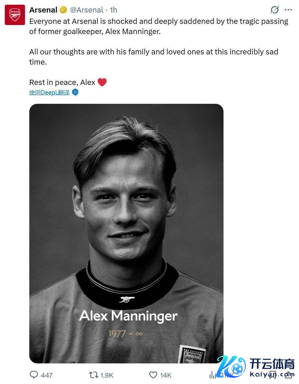 阿森纳、尤文图斯等俱乐部官方酬酢媒体也接踵发文,深刻吊问曩昔门将亚历山大·曼宁格的离世。